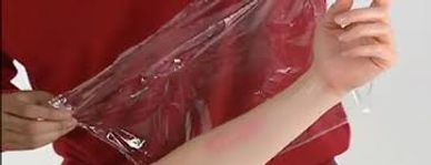 Clingfilm should be layered and not wrapped around the burn. This prevents over heating and easy removal.