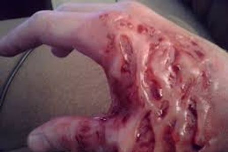 The old saying "burnt to the bone" this is a severe deep burns, nerves are destroyed and there is very high risk of infection.