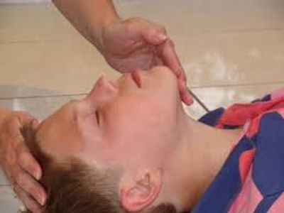 Place the palm of one hand on top of the child's forehead. Place your other hand on the bone of the child' chin and gently tilt the head back.